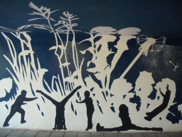 de leerlingen hebben met de kunstenaars van het eerste idee tot en met het eindproduct samengewerkt. Ieder kreeg een plek. We spraken over kunstenaarschap, fotografie, lijnen, schilderen, de wereld in groot of klein.. Er verscheen een grafisch ‘knipsel’ met kleine precieze silhouetten die zich laten voortbewegen of spelen tussen grote bloemen, gras en stengels. Een droomlandschap.