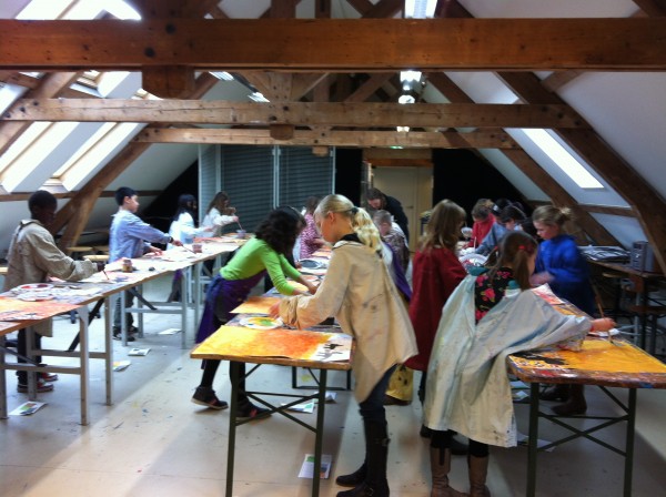 de leerlingen hebben met de kunstenaars van het eerste idee tot en met het eindproduct samengewerkt. Ieder kreeg een plek. We spraken over kunstenaarschap, fotografie, lijnen, schilderen, de wereld in groot of klein.. Er verscheen een grafisch ‘knipsel’ met kleine precieze silhouetten die zich laten voortbewegen of spelen tussen grote bloemen, gras en stengels. Een droomlandschap.